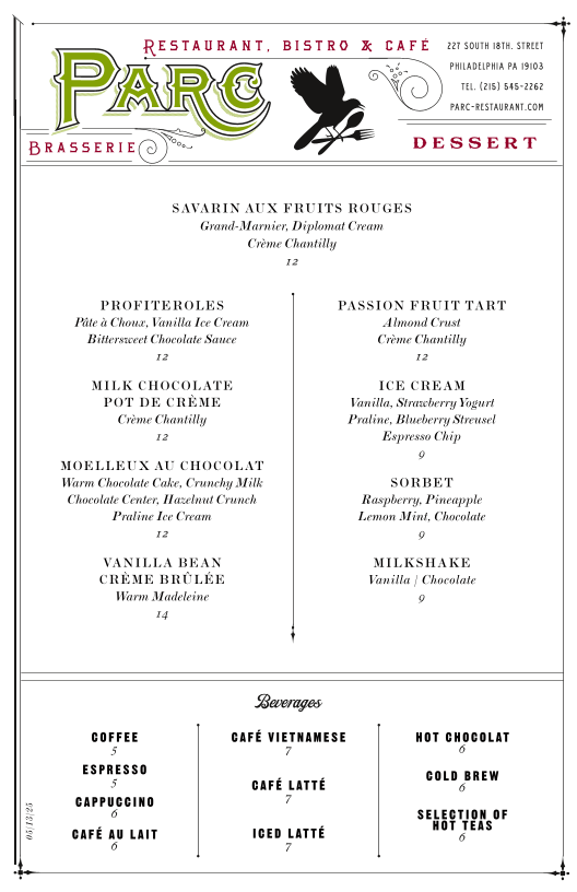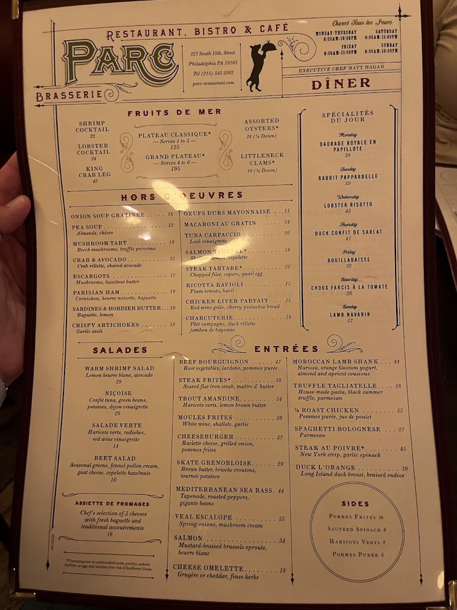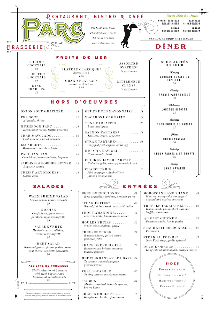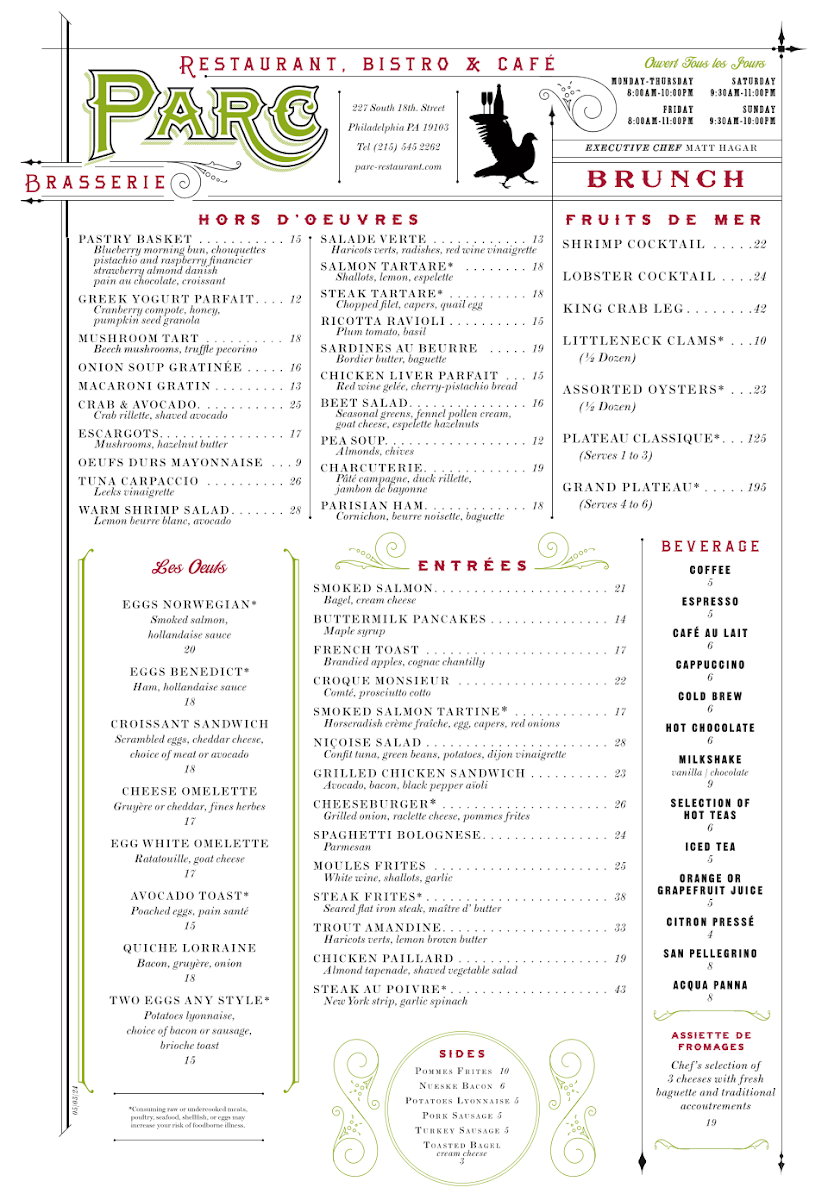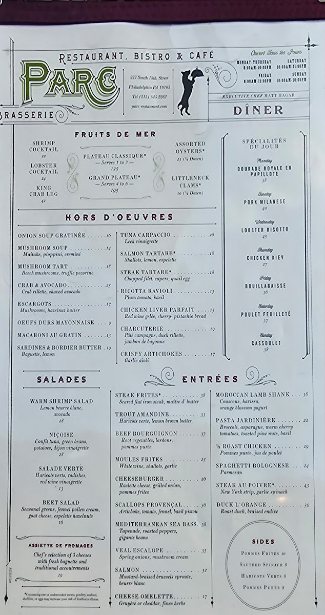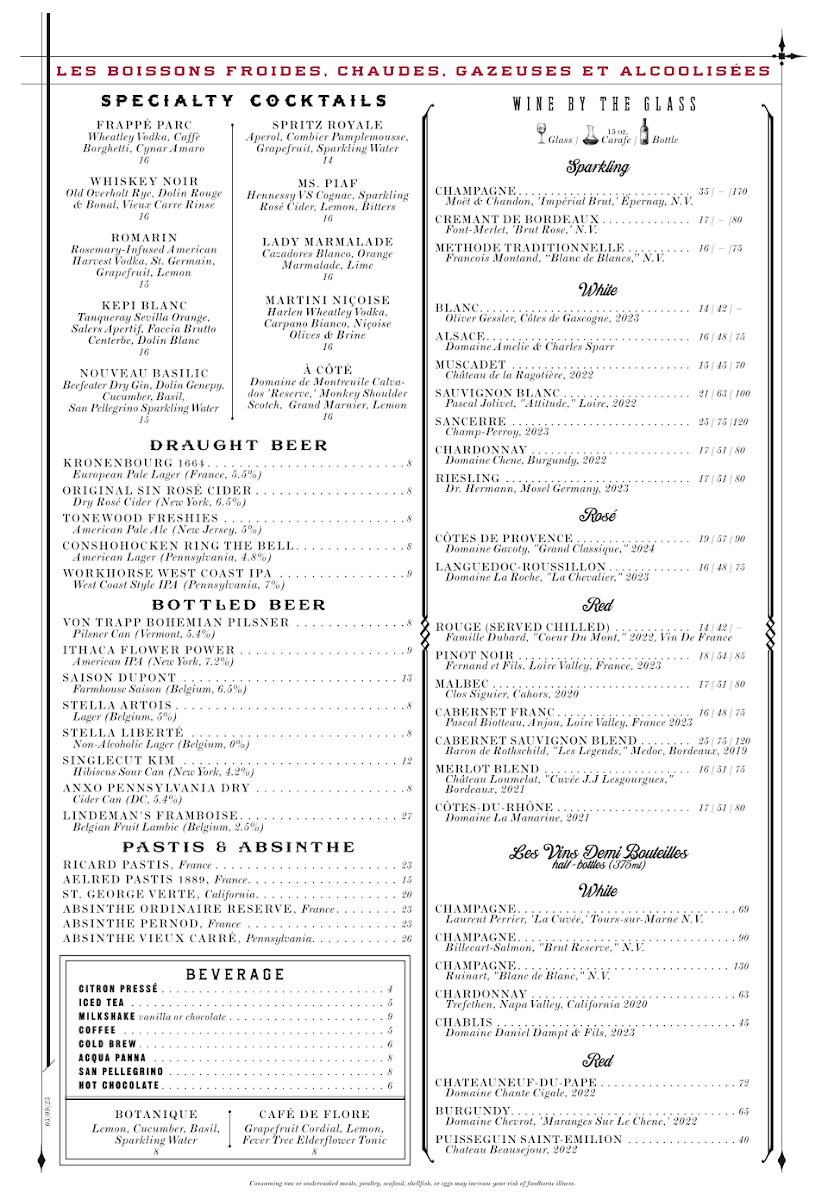 The menu at Parc reflects a refined yet approachable approach to modern French dining, thoughtfully curated for any time of day. Whether you're stopping in for breakfast, brunch, or dinner, the offerings pair classic French techniques with the comforting simplicity of American favorites.